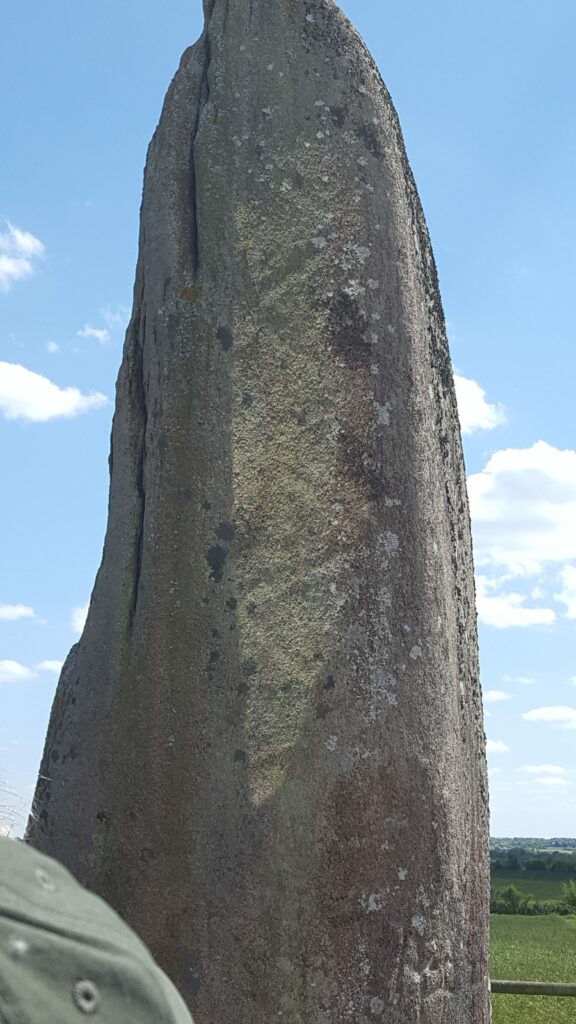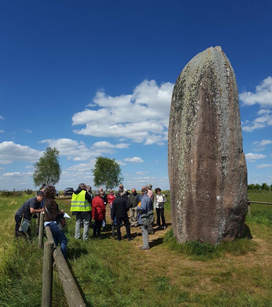 L’après-midi, Paul Raux et Gérard Berthaud, deux bénévoles passionnés par l’archéologie locale, nous ont montré les monuments néolithiques de la région de Saint-Macaire-en-Mauges. Les hommes du Néolithique entretenaient des relations cultuelles avec ces mégalithes, des cultes qui pouvaient y être associés et donner lieu sur certains menhirs à des gravures de figures géométriques, voire anthropomorphes ou autres….comme le grand menhir de la Bretellière ou bien « le menhir couché de la Bretellière ».