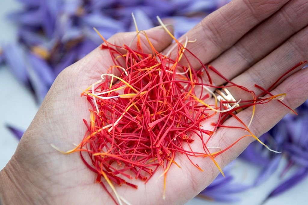 Le Safran, un pistil à 3 stigmates du Crocus sativus, 12 kg produits par an en France contre 240 t en Iran. Dans 1g, il y a entre 150 et 250 fleurs. Un véritable or rouge !