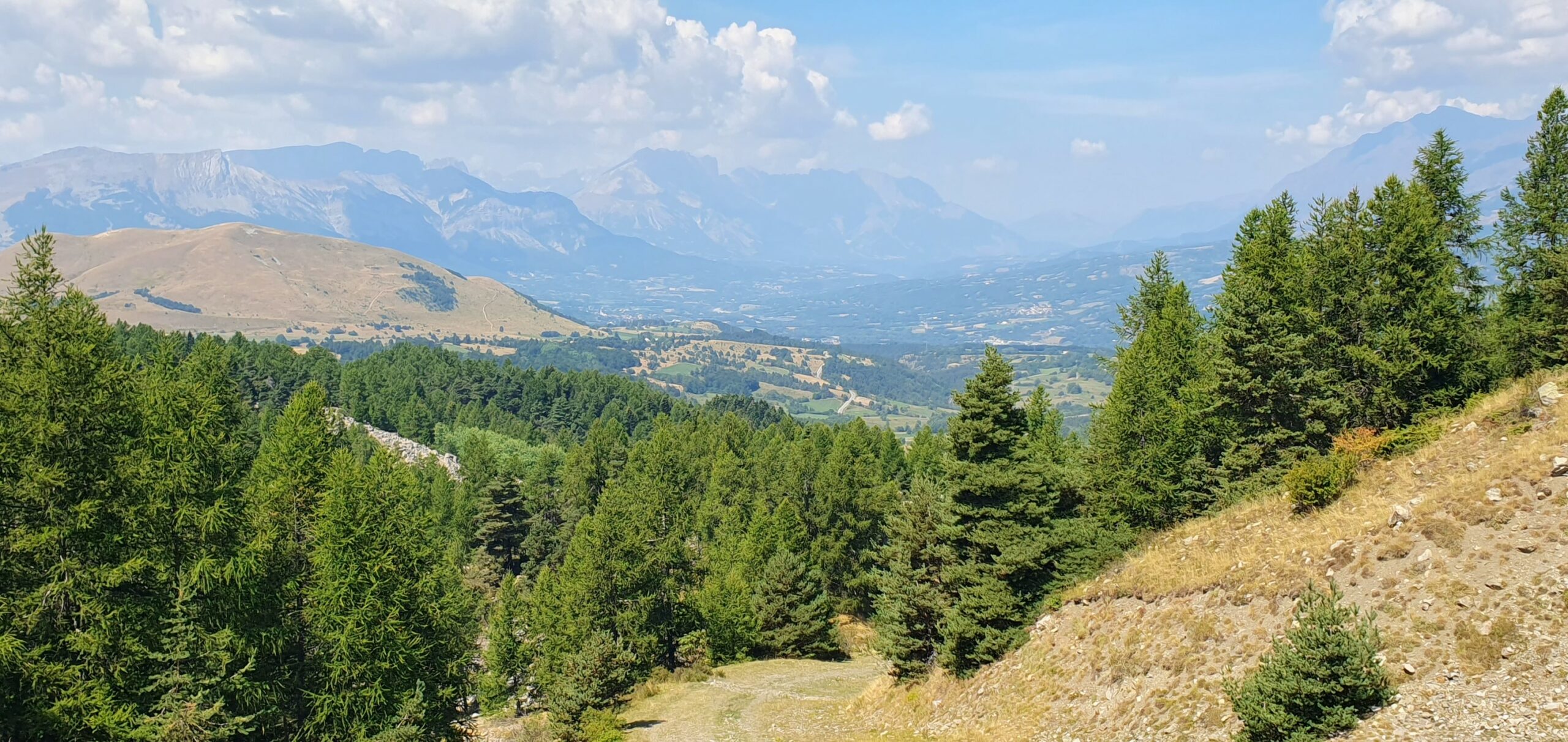 Vue vers le nord-ouest : le massif calcaire du Dévoluy, le sillon alpin et le début du Champsaur, piémont sud du massif des Écrins