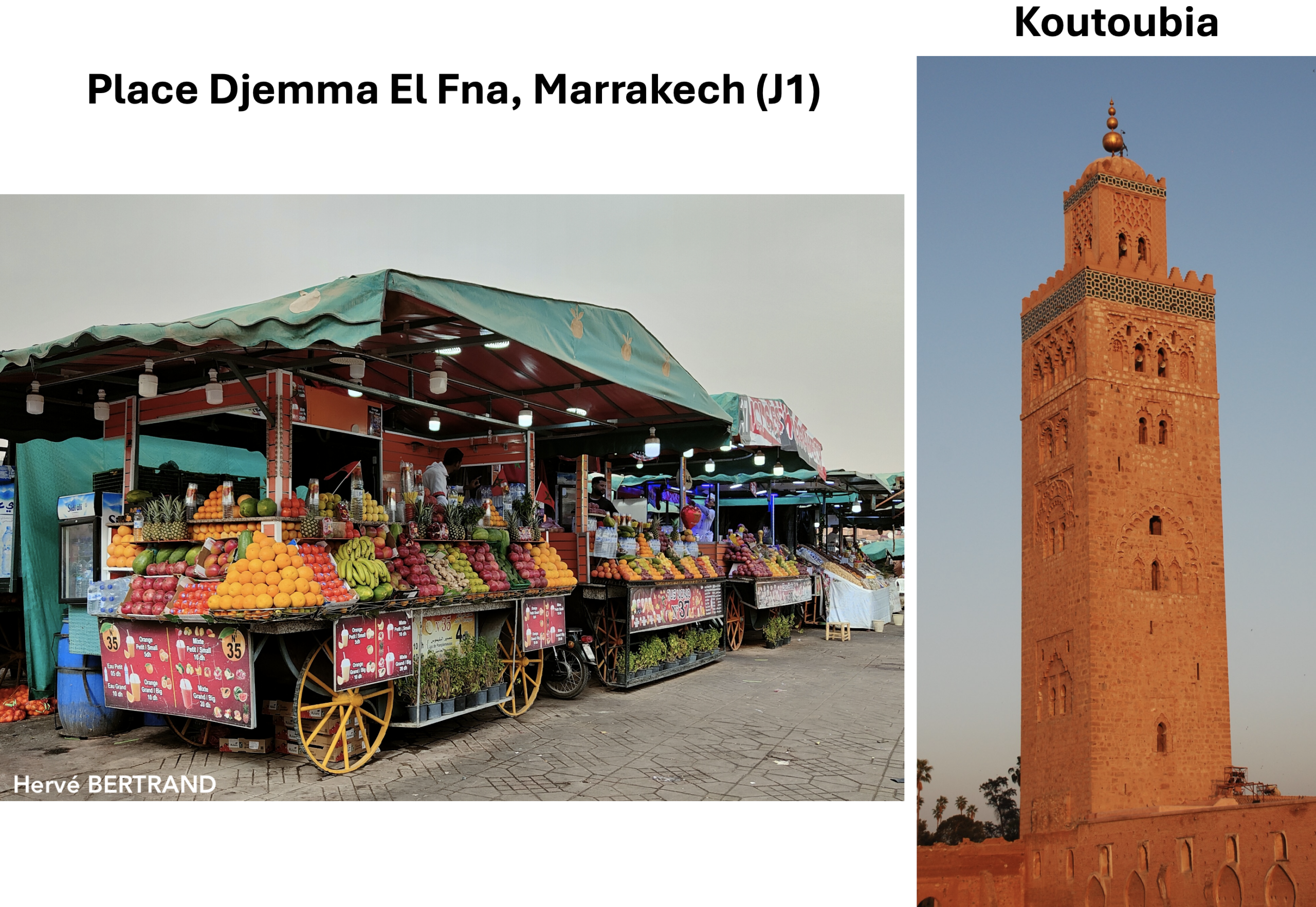 • Visite de Marrakech avec notamment : la place Jemma El Fna, le souk, le palais Bahia, les tombeaux Saadiens, le quartier Koutoubia, la maison Majorelle. (La visite de ces sites sera répartie sur différents jours).