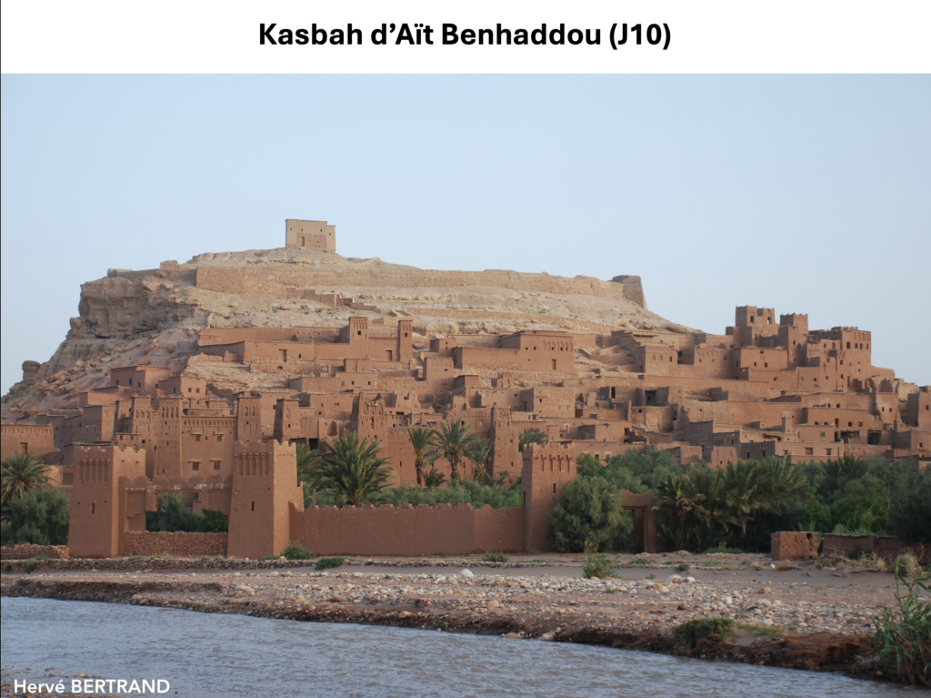• Kasbah d’Aït Benhaddo, village fortifié (= un ksar) berbère fondé au IXè, classé patrimoine mondial de l’UNESCO, avec ses maisons en pisé rouge, ses terrasses avec vue sur la vallée de l’Ounila et le Haut Atlas, ses anciens greniers et caravansérails de l’époque des caravanes transsahariennes entre Marrakech et le Soudan. C’est aussi « le Hollywood marocain » puisqu’il y a été tourné Lawrence D’Arabie, Gladiator, le Seigneur des Anneaux, Game of Thrones…